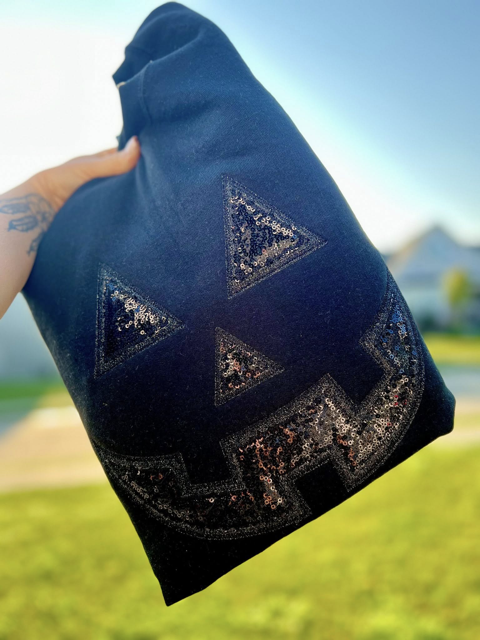 - Black/White/Orange - black crewneck pullover, white glitter, orange sequins